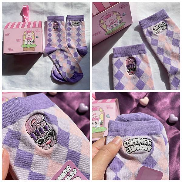 紫色的襪身為三色菱形﹐酷酷風的戴墨鏡小兔圖案