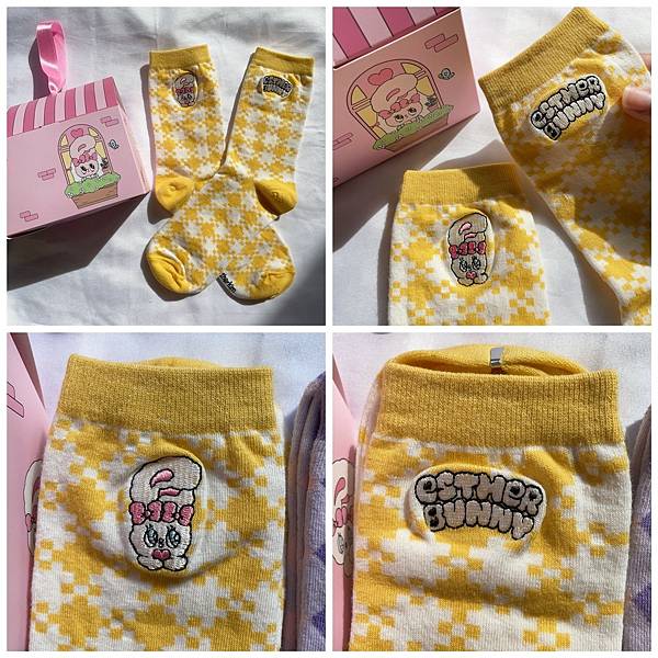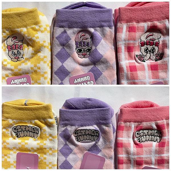 艾絲樂小兔襪子顏色有黃、紫與粉,襪身以幾何圖案搭配