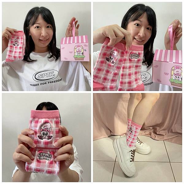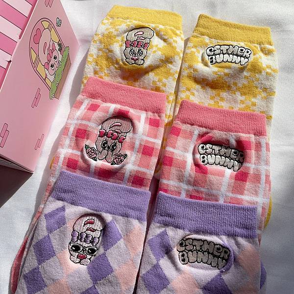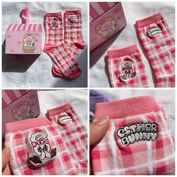 粉色的襪身為方格與線條﹐小兔是帶花粉嫩嫩圖案