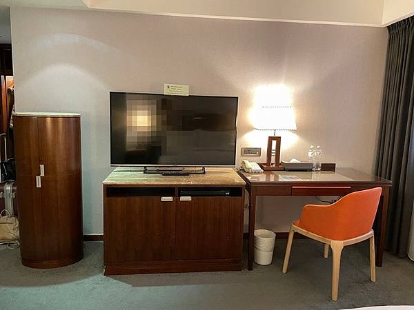 電視旁有一桌子可擺放物品或辦公用