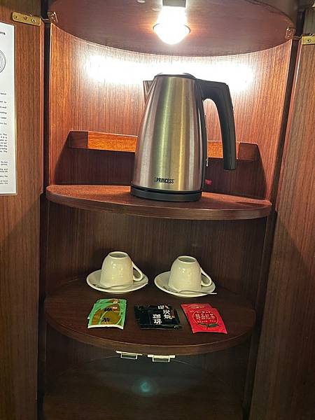 圓柱櫃打開門就會亮燈﹐裡面有熱水壺、杯子、茶包
